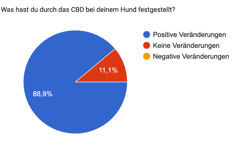 Wir haben eine Umfrage unter Hundehaltern durchgeführt, die bereits CBD bei ihren Hunden getestet haben. Knapp 90 % gaben hier an, dass sie positive Veränderungen bei ihren Hunden festgestellt haben.
