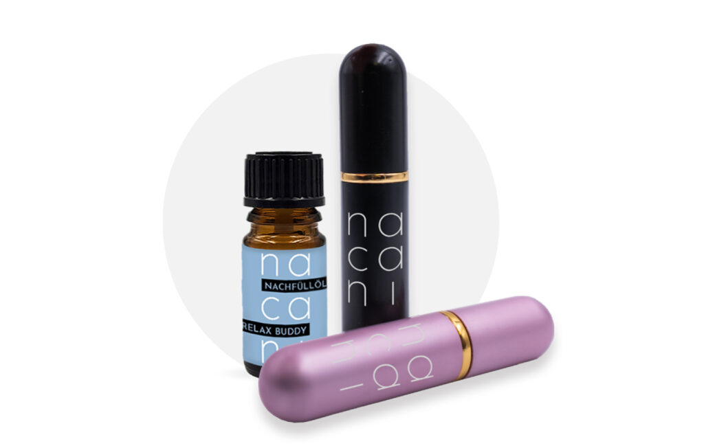 The connection between a scent and relaxation is created through conditioning – learning through associations. Think of the process like charging a battery. You have to charge it first before you can use it. Use the nacani Relax Buddy for this. It’s a small scent stick (similar in size to a lip balm) containing a calming blend of high-quality essential oils with hemp and lavender.